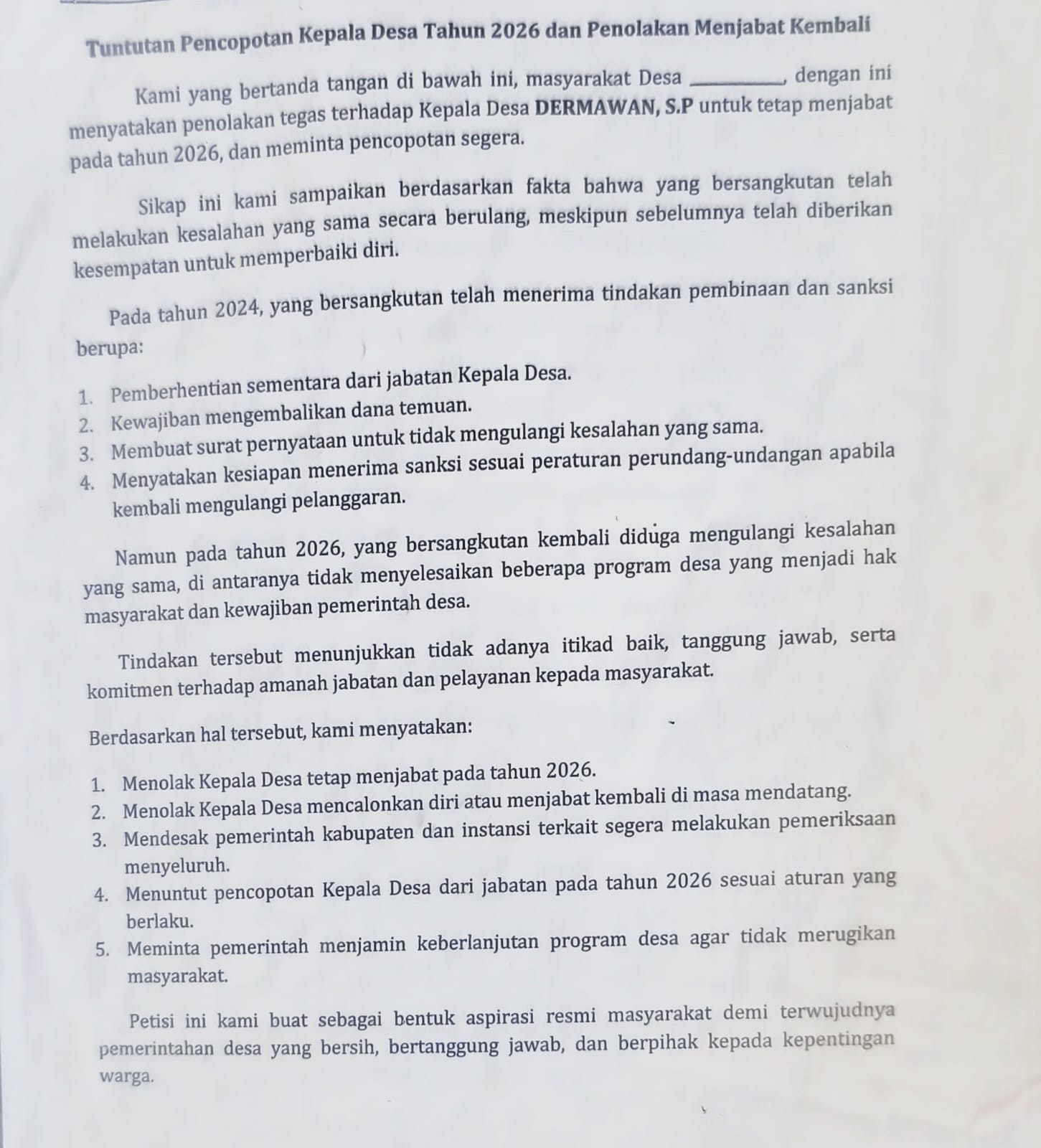 Selain meminta Dermawan di copot dari kepala Desa Lekopadis, lanjut Mudir, pihaknya juga mendorong agar pihak terkait segera melakukan pemeriksaan penggunaan Dana Desa Sejak Dermawan menjabat sebagai kepala desa Lekopadis.